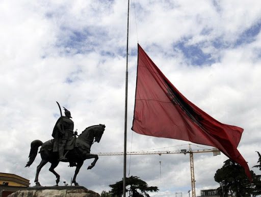 An Albanian national flag flies at half-mast in front of Albanian national hero George Kastriotis Skanderbeg on a national day of mourning in Tirana, May 22, 2012, after a bus crash took place on Monday in southern Albania. At least 12 Albanian university students and the driver of the bus were killed and 22 others injured when their bus plunged hundreds of feet into a ravine on Monday, police said. REUTERS/Arben Celi (ALBANIA - Tags: DISASTER TRANSPORT)