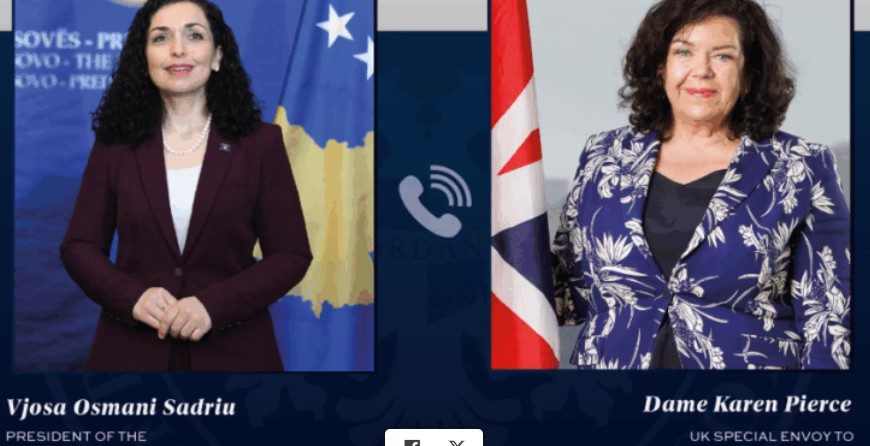Presidentja e Kosovës, Vjosa Osmani, ka njoftuar se ka zhvilluar një bisedë me Dame Karen Pierce, të dërguarën speciale të Mbretërisë së Bashkuar për Ballkanin Perëndimor.