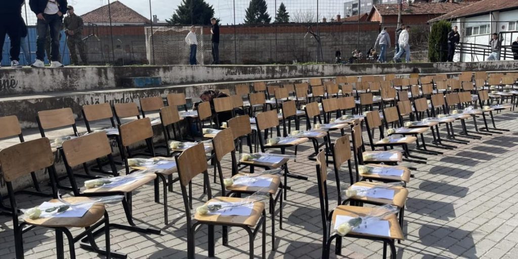 Në oborrin e Gjimnazit “Frang Bardhi” në këtë qytet janë vendosur 104 karrige, me 104 emrat e të zhdukurve.