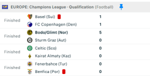 Ndërsa dy ndeshjet tjera, Fennerbahce – Benfica dhe Celtik – Kairat Almaty, përfunduan me rezultat të barabartë, 0-0.